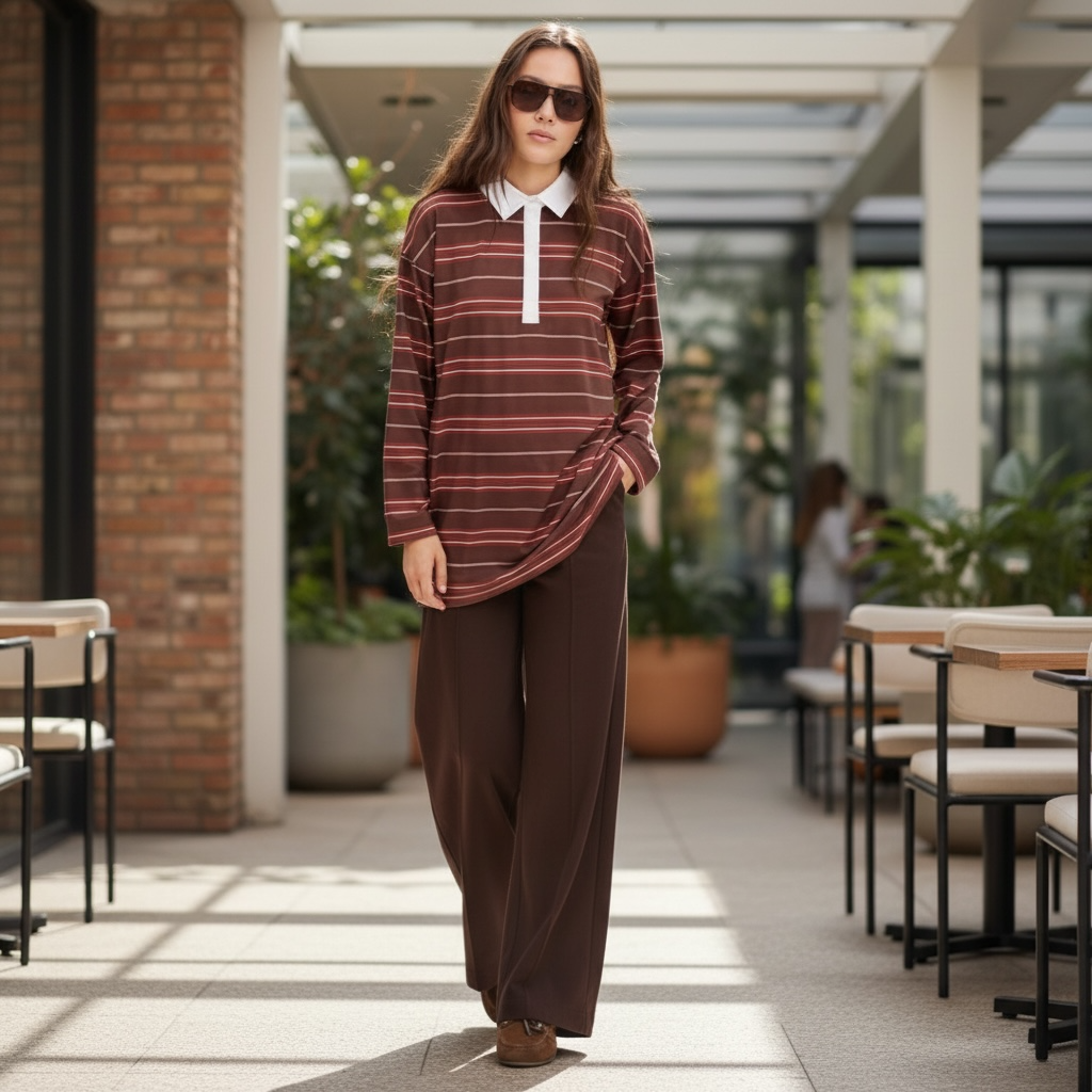 De zachte stof, de subtiele strepen en de witte kraag geven een sporty-chic vibe die moeiteloos te combineren is.